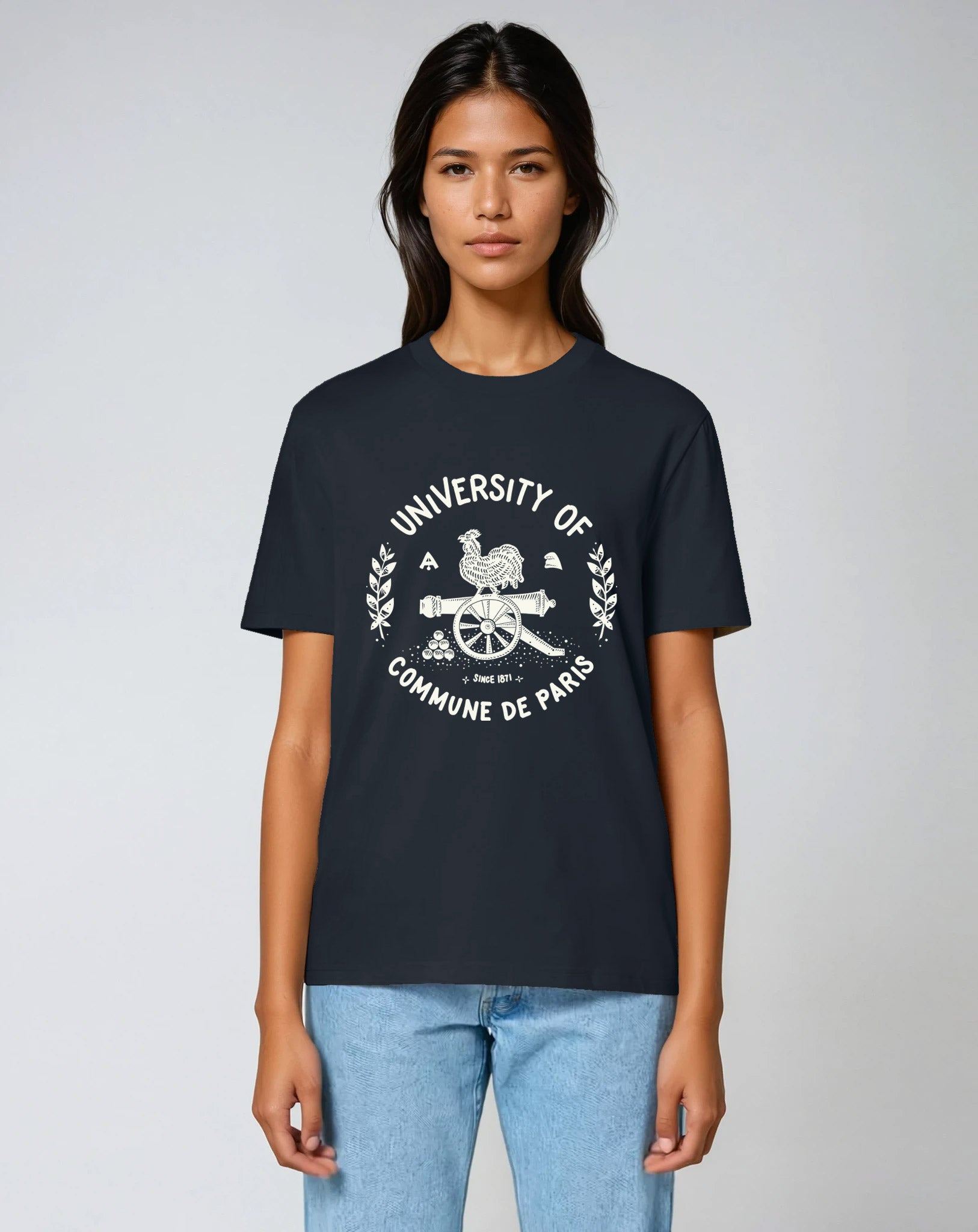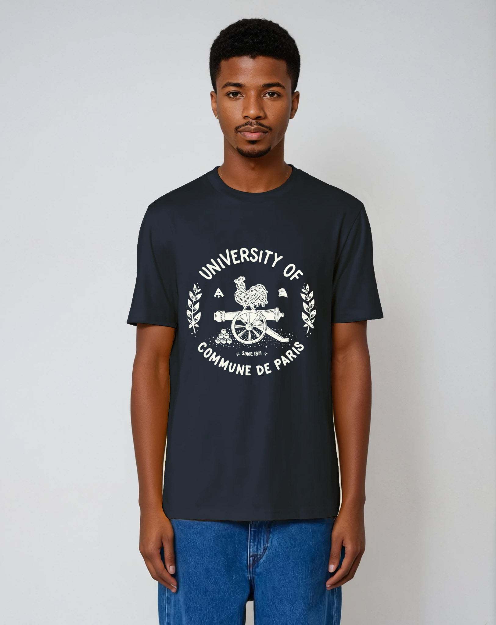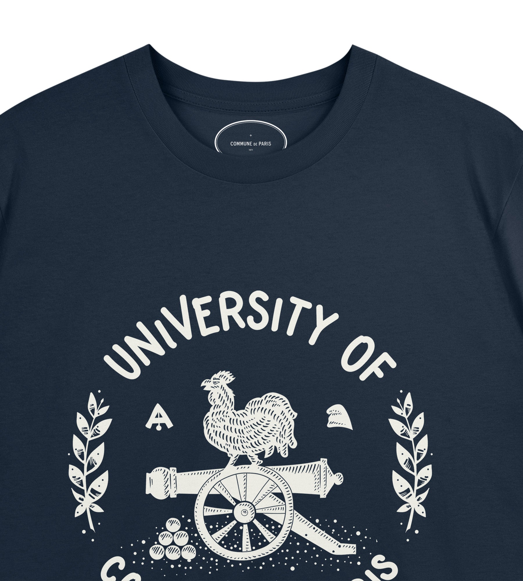 Un classique revisité, entre blason académique et manifeste textile. Le coq veille sur le canon comme un doyen sur ses principes, et les lauriers encadrent une pensée libre, indisciplinée, indélébile.