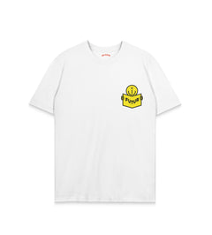 Une mascotte tombée de la lune ou sortie d'un carnet de croquis ? Sur un bleu marine profond, ce kid au trait blanc naïf pointe son doigt vers le ciel — et vers l'avenir. Une touche d'innocence graphique qui nous guide, en plein cœur.
